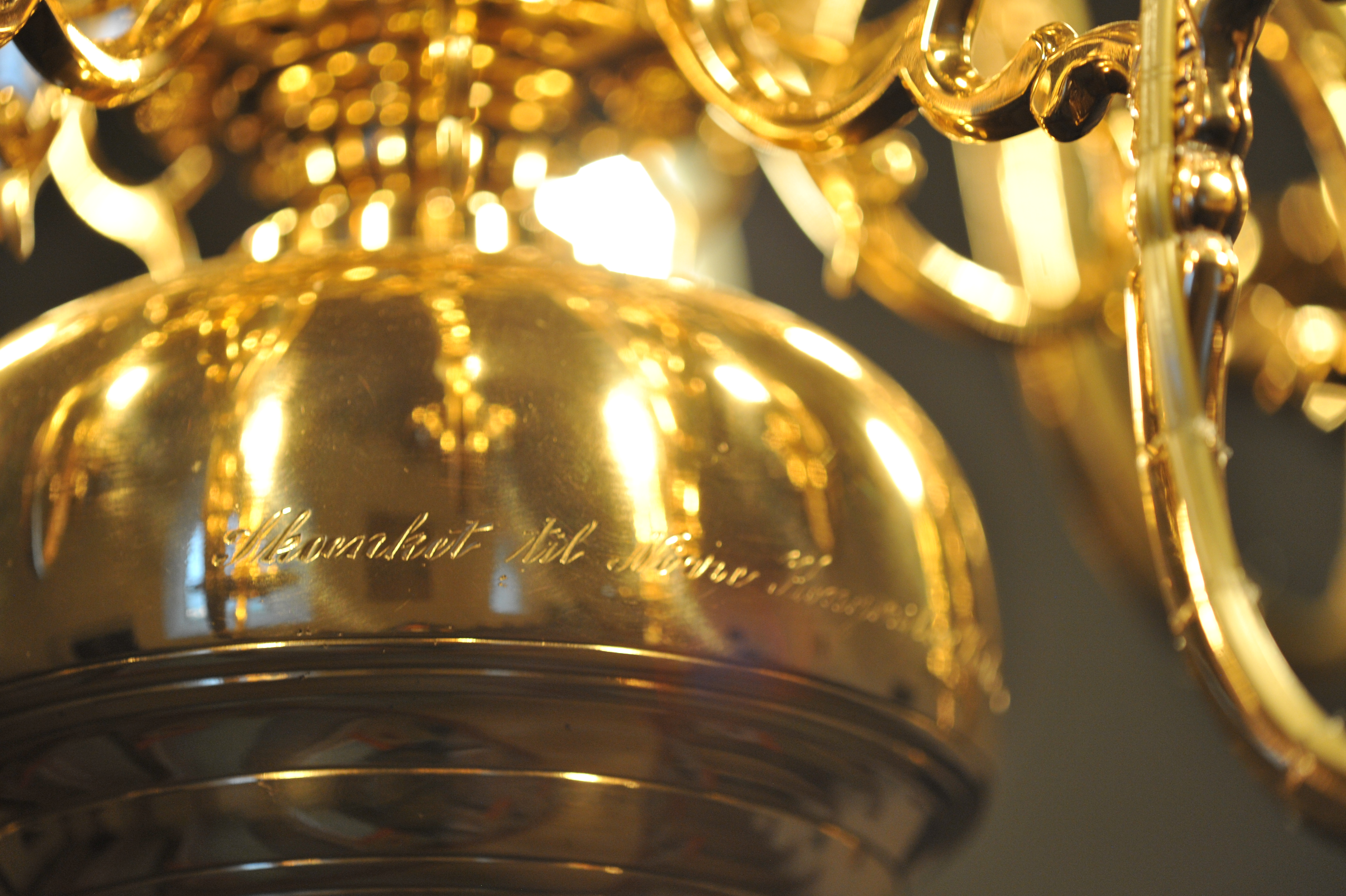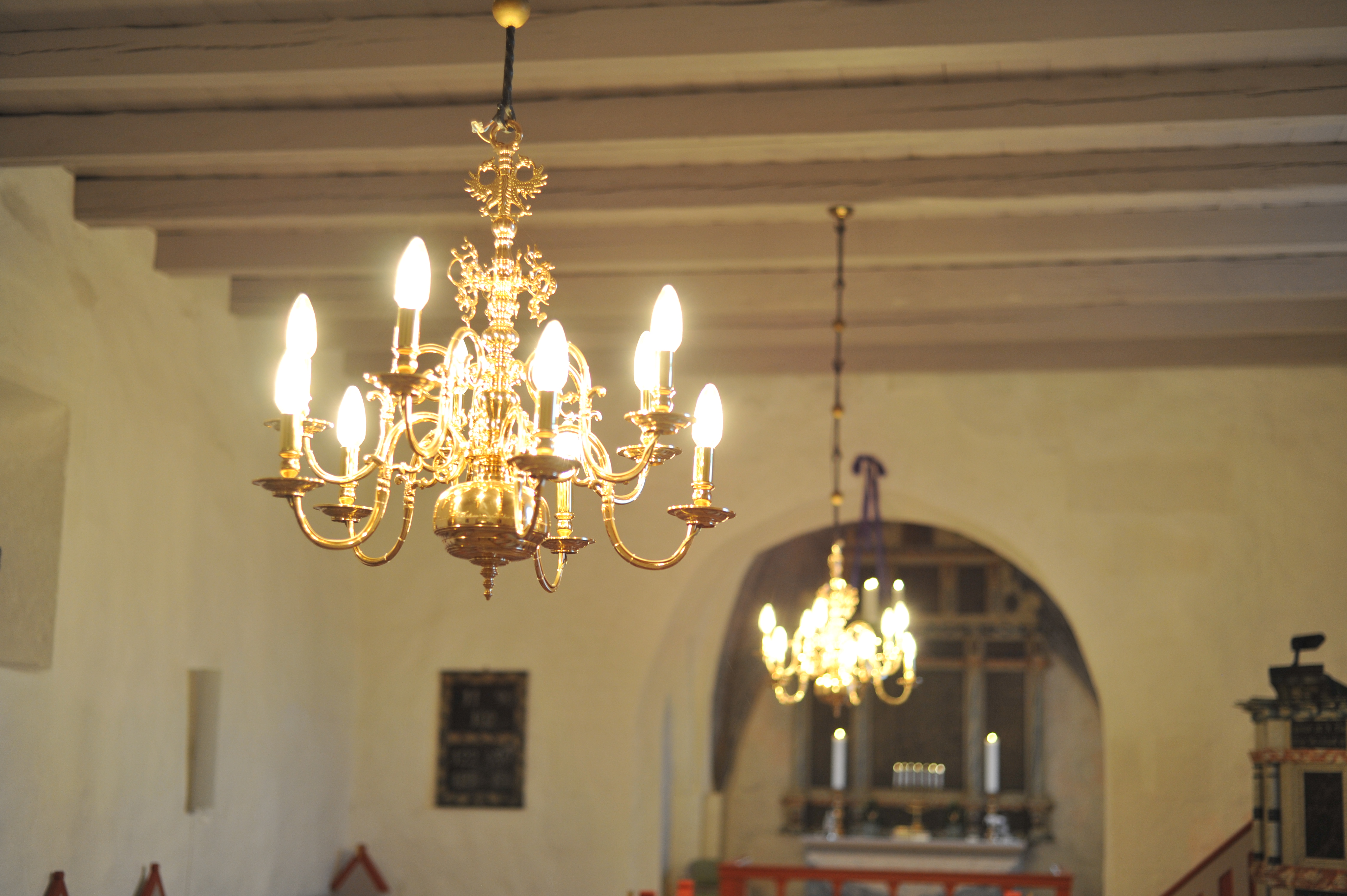 Over midtergangen hænger der to tiarmede lysekroner, begge fra 1930.