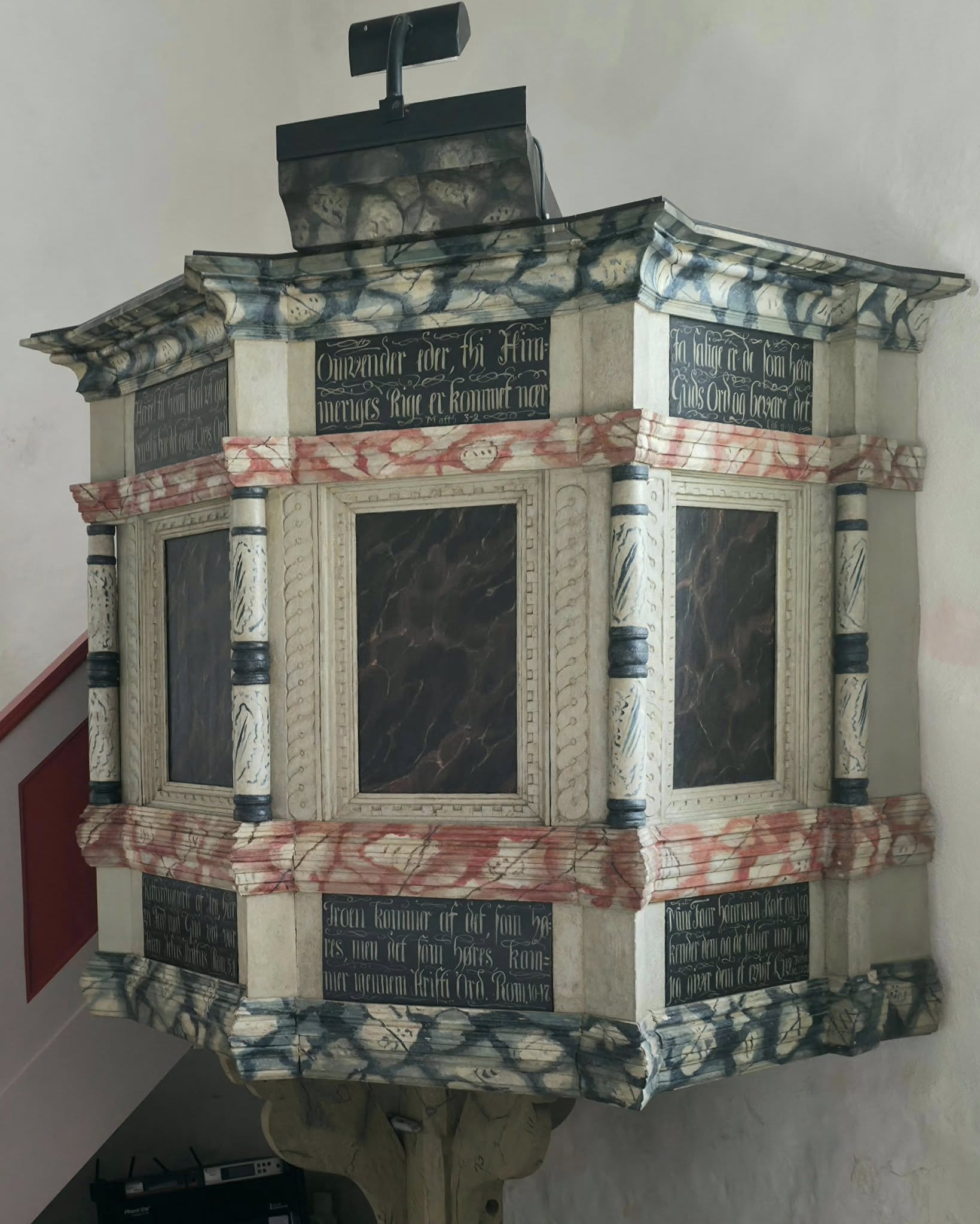 Prædikestolen svarer i stil til altertavlen (men menes dog at være 100 år yngre) og har samme bemaling, der er præget af marmorering i flere farver. Den er stjerneformet og har på hjørnerne små søjler.