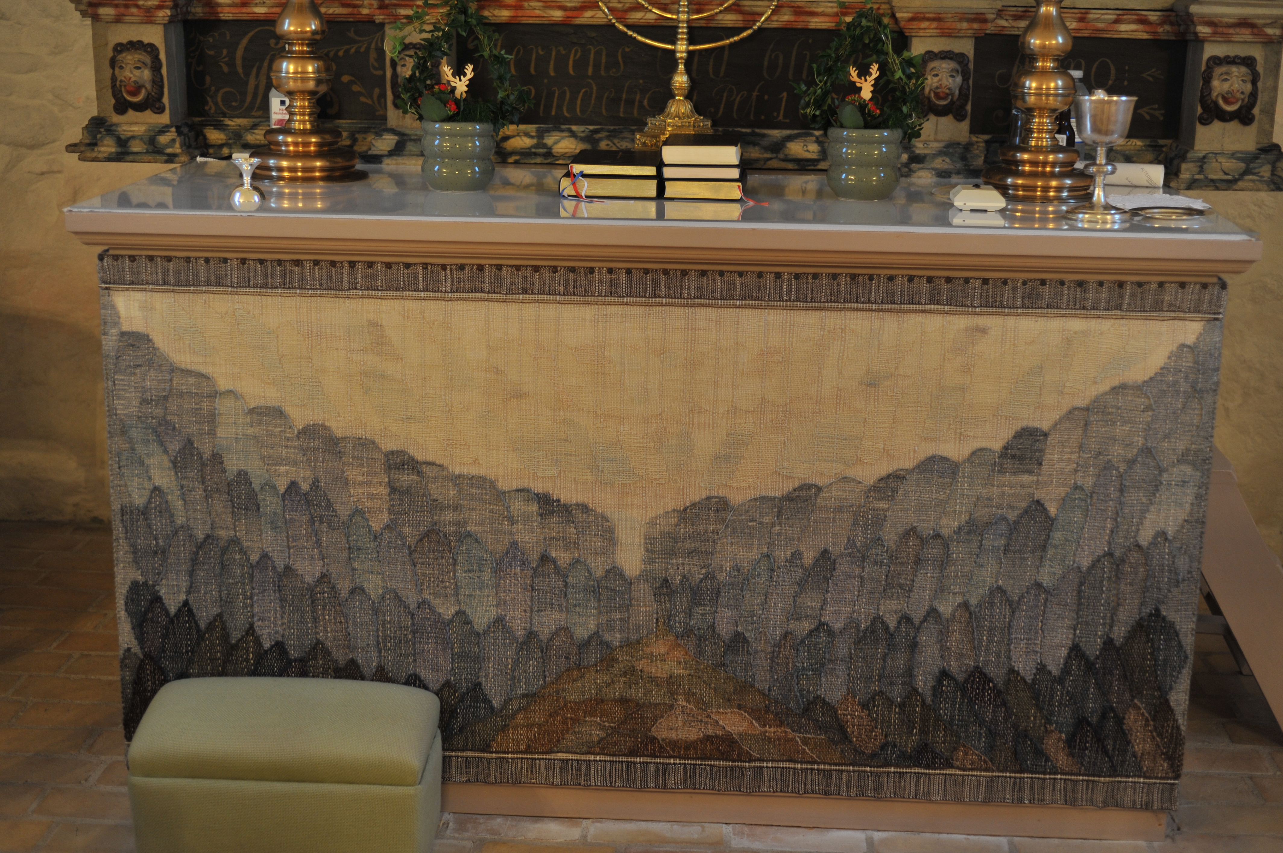 Samtidig blev der rundt om alterbordet opsat et antipendie, vævet af kunstneren Berit Hjelholt. Det er i sine farver afstemt efter kalkmaleriet.