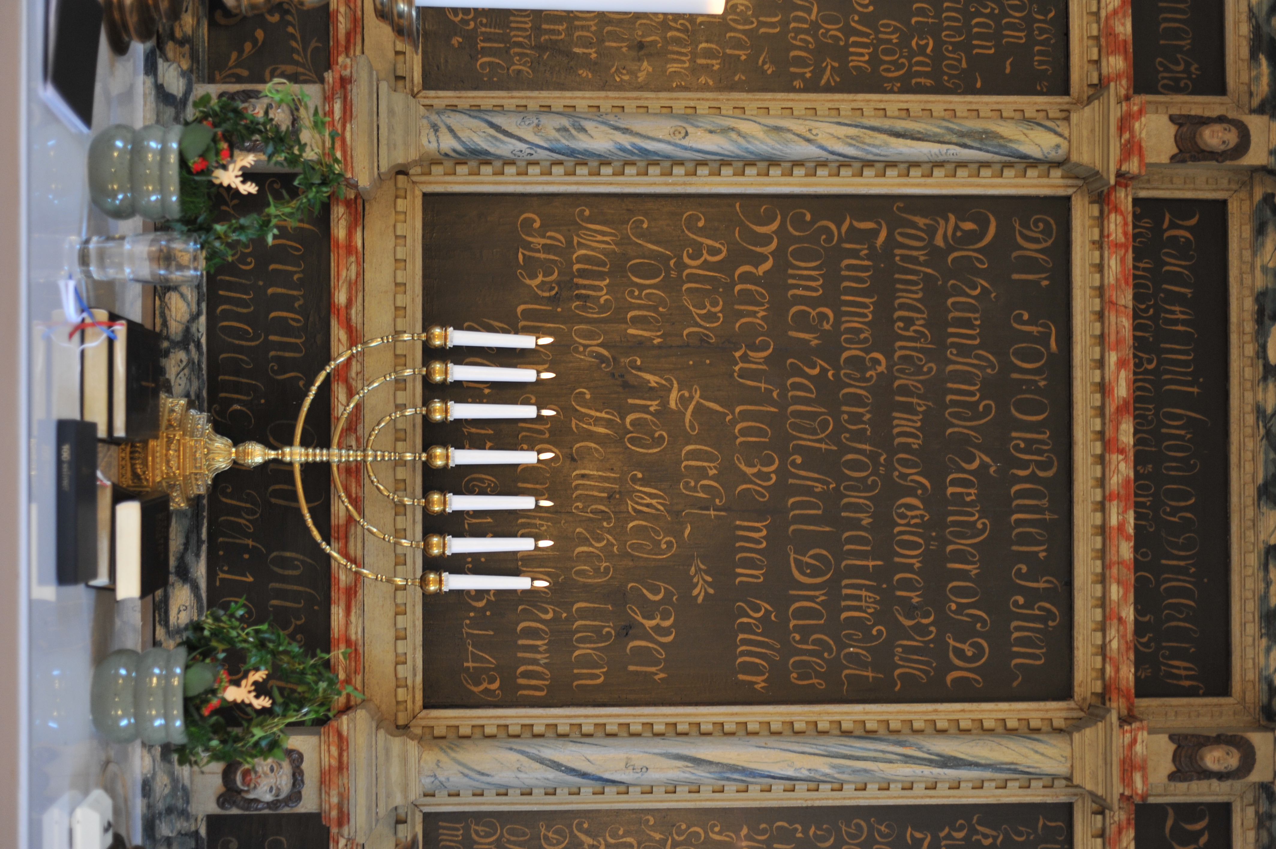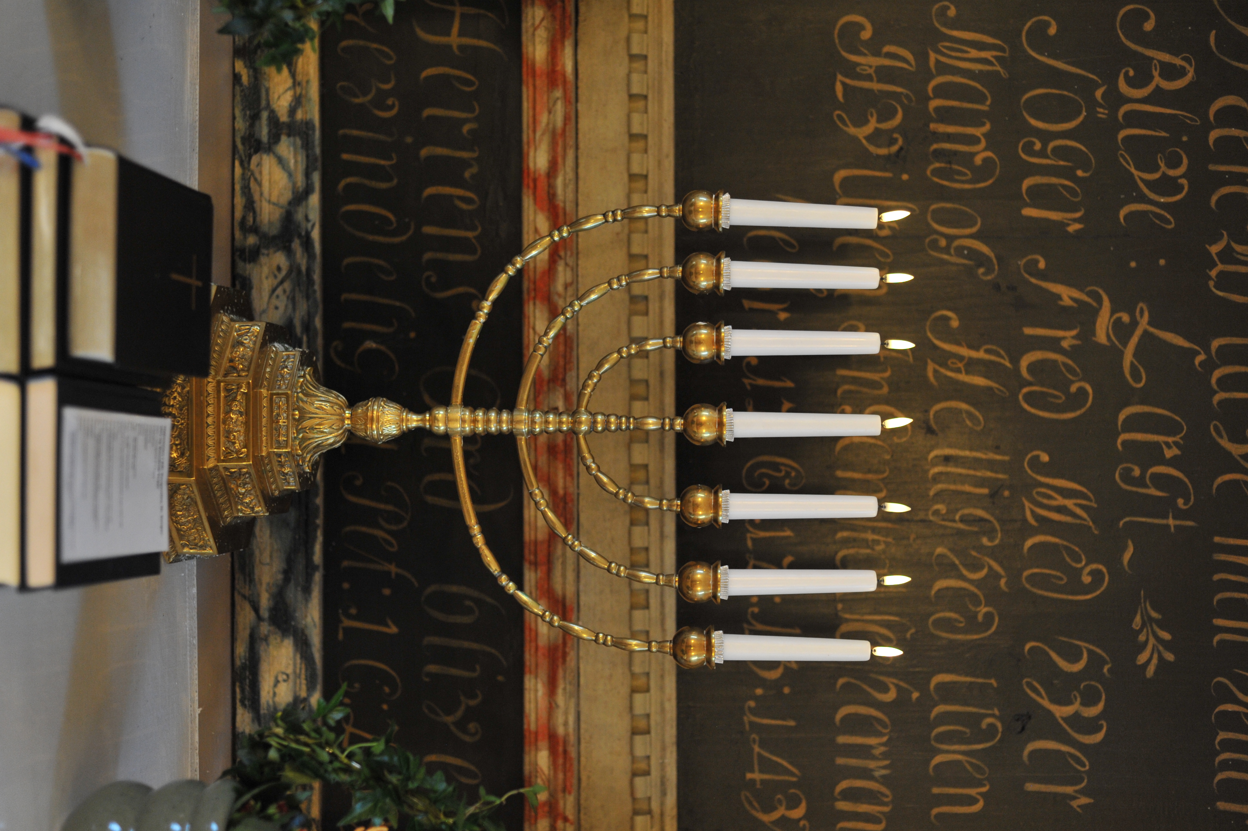Den syvarmede lysestage, der står på alteret er skænket kirken af Lærerinde Inger Andrea Christensen