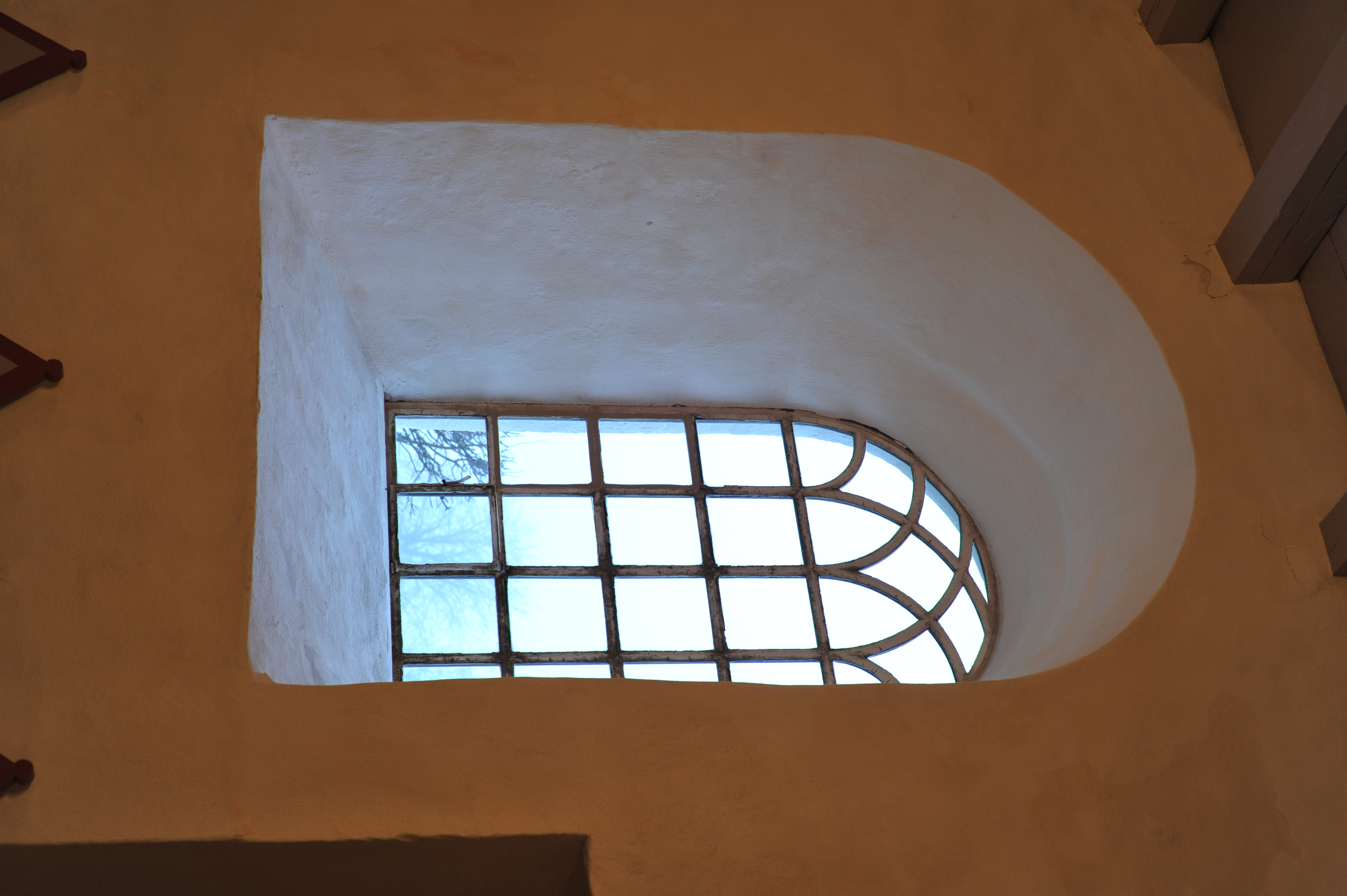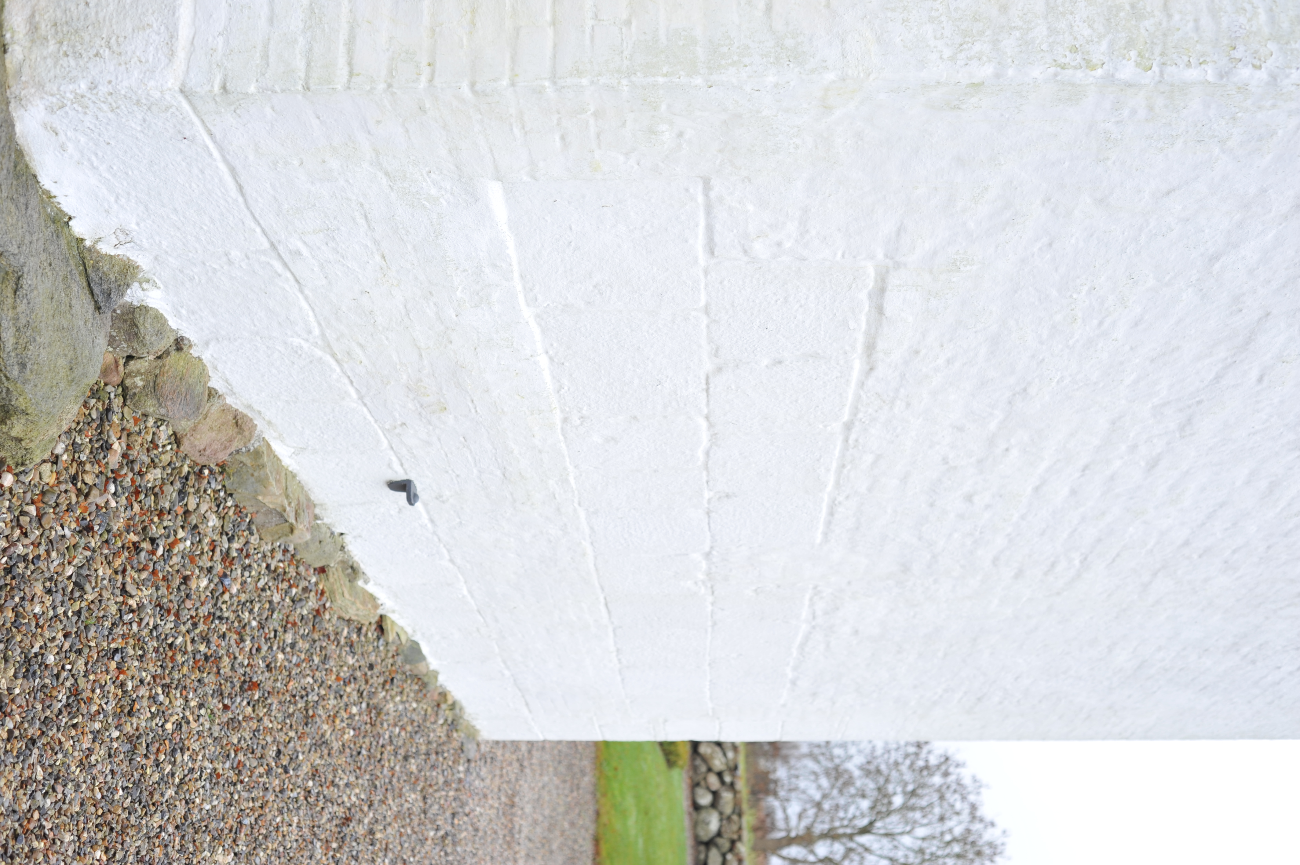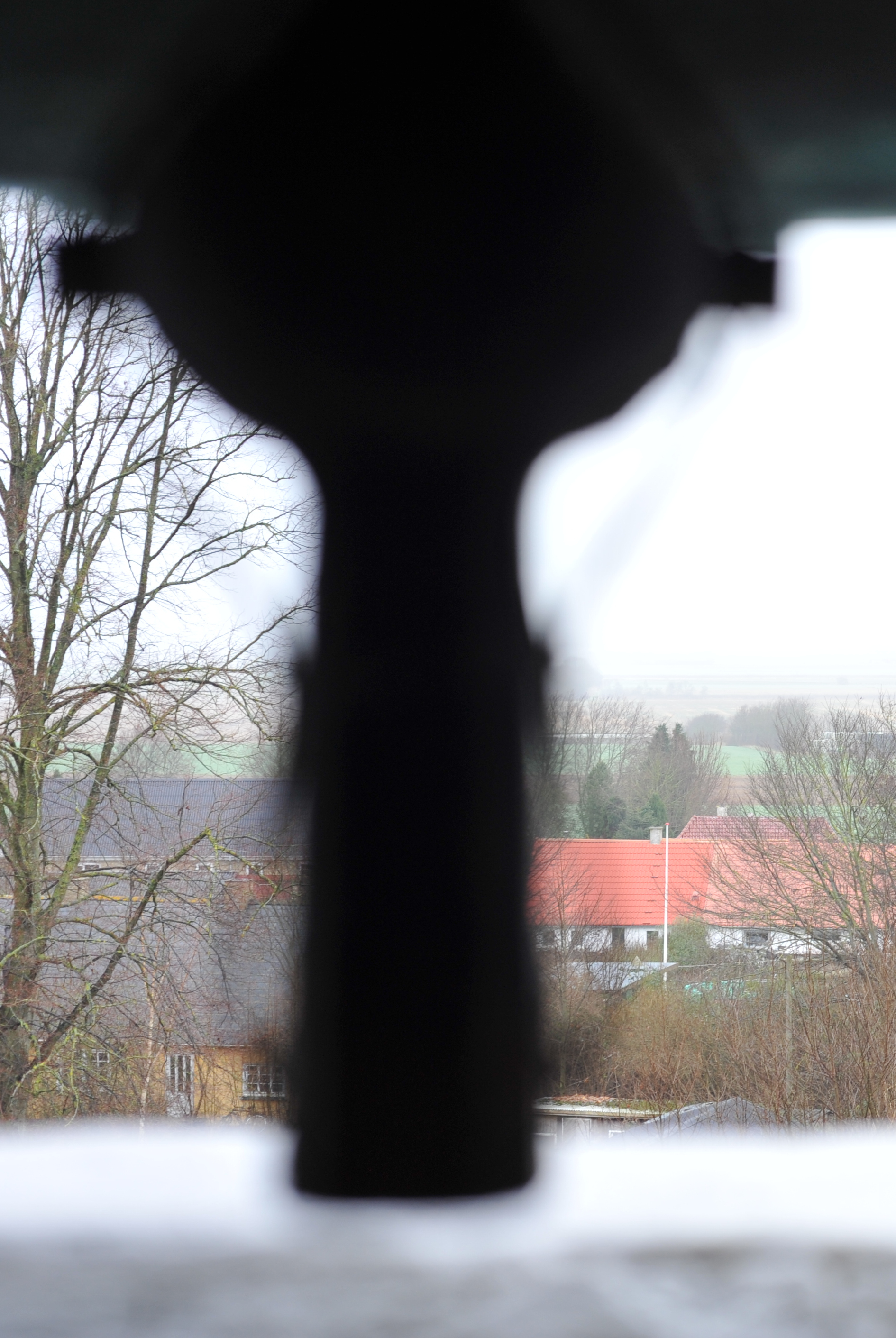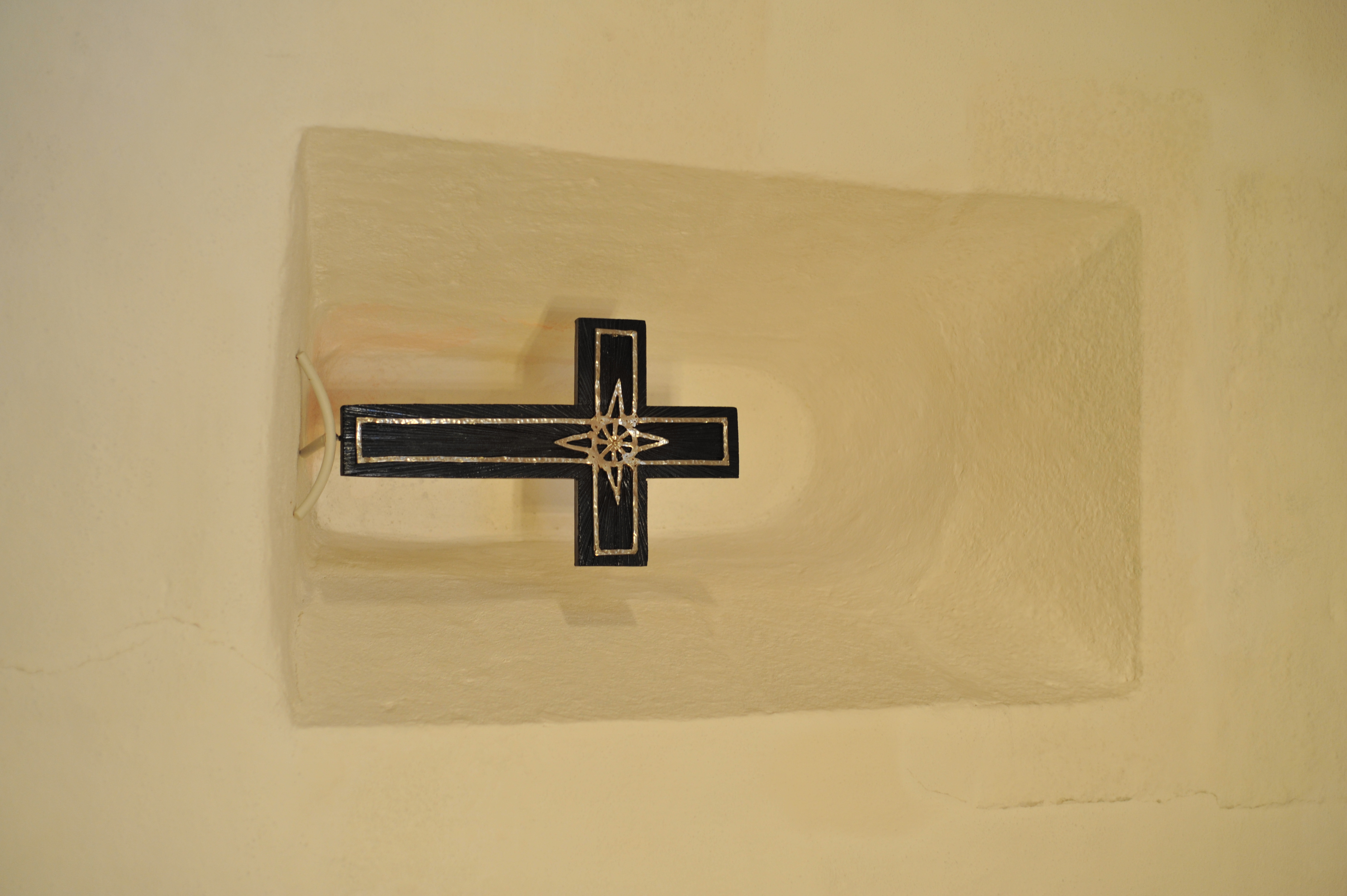 I det tilmurede nordvindue står et lille moderne kors lavet af den lokale kunstner Oluf Melgård.
