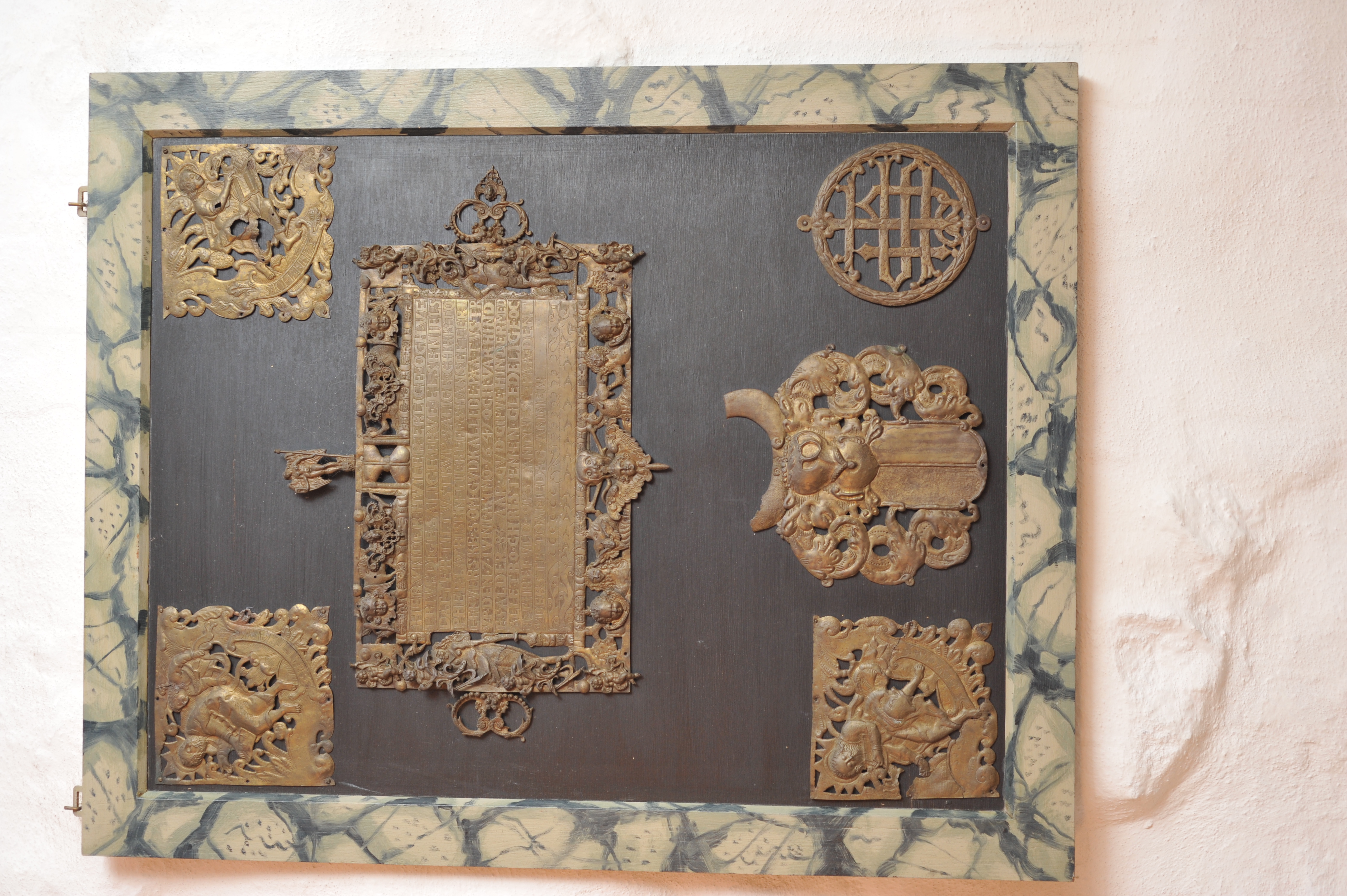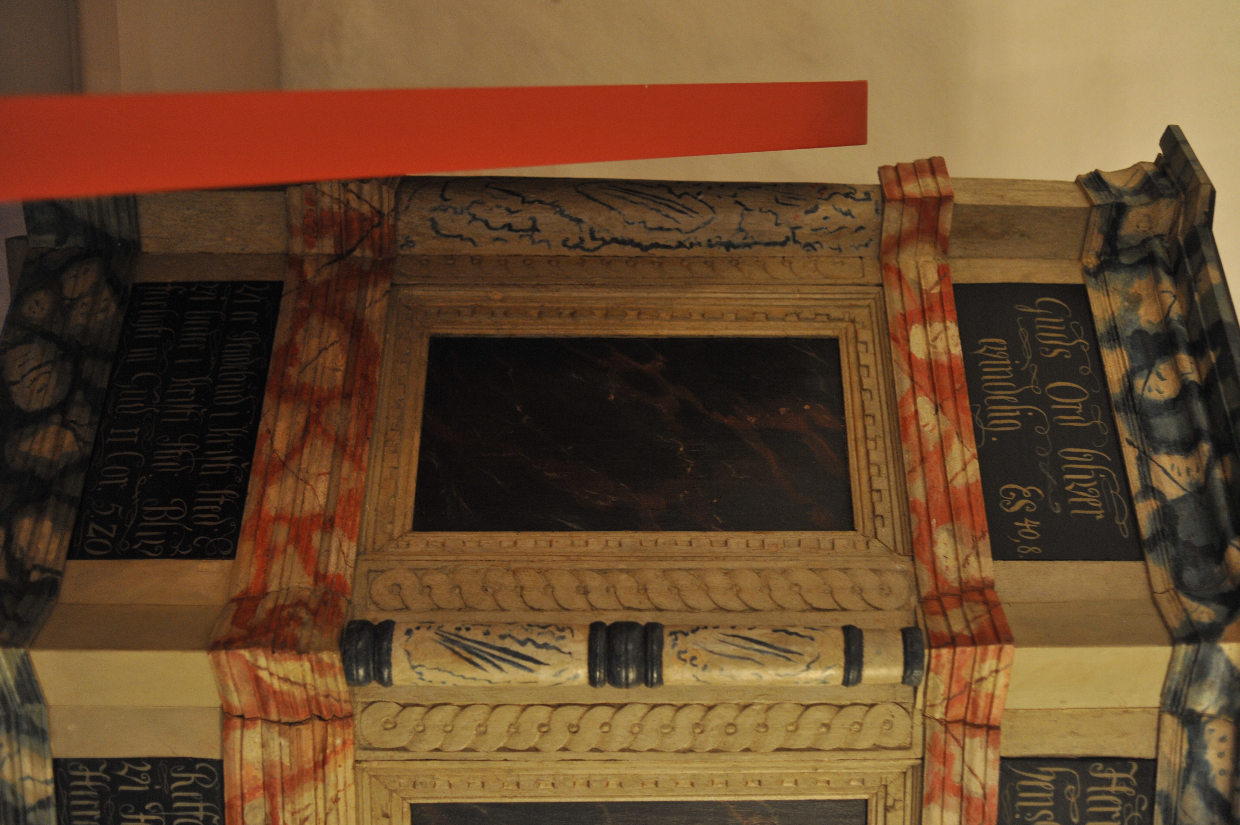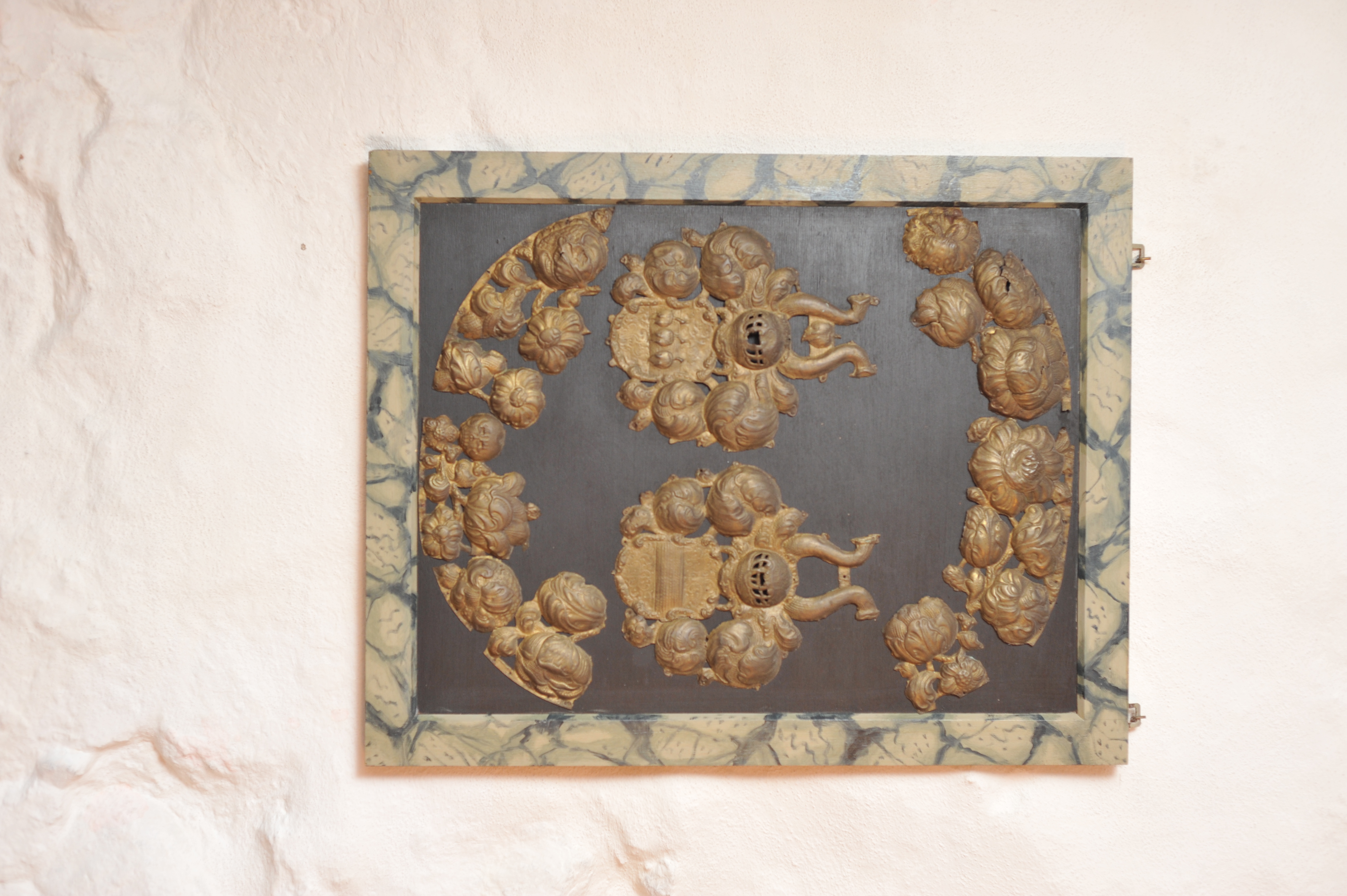 På vestvæggen hænger der to kistebeslag fra 1600-tallet, fundet i gravhvælvingen under koret.