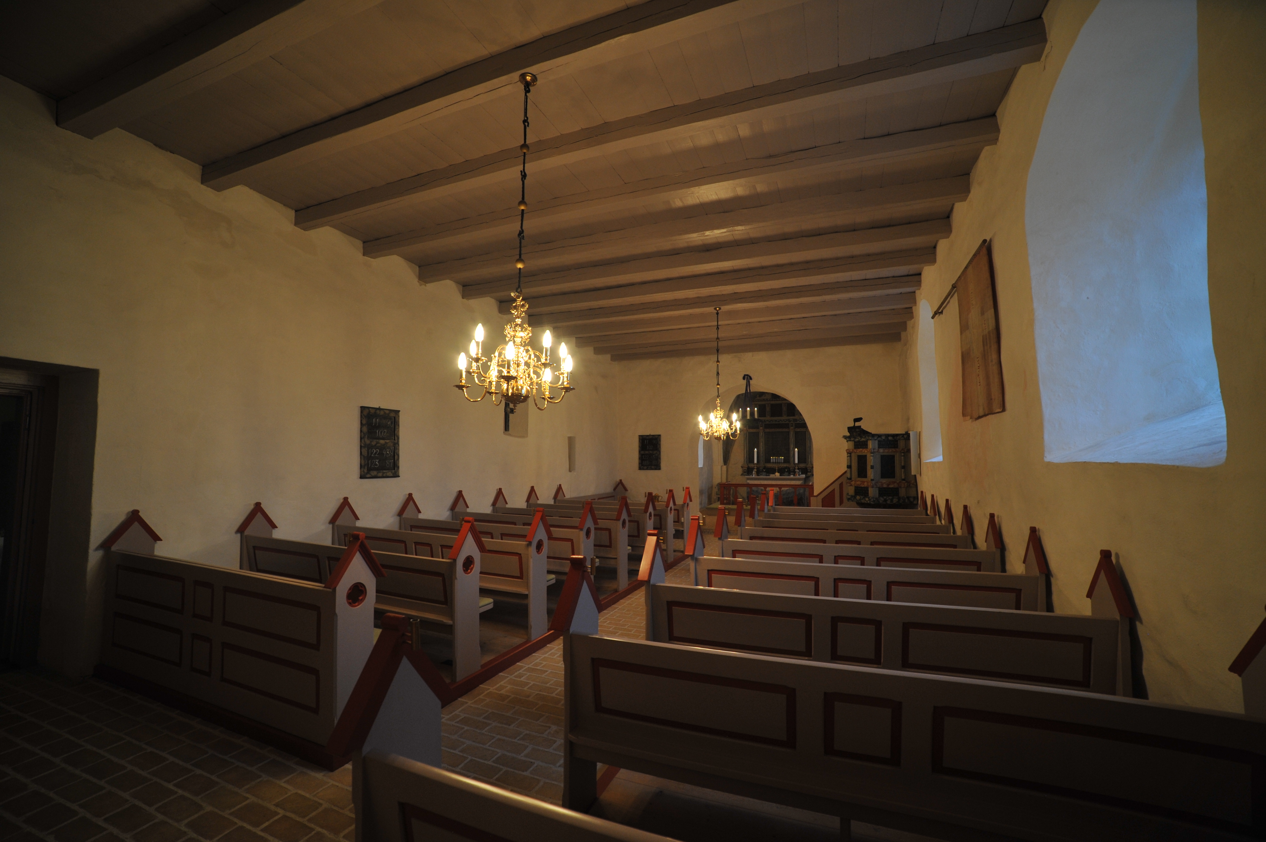 Indvendigt domineres kirken af de hvidkalkede vægge og det oprindelige romanske flade bjælkeloft i skibet.